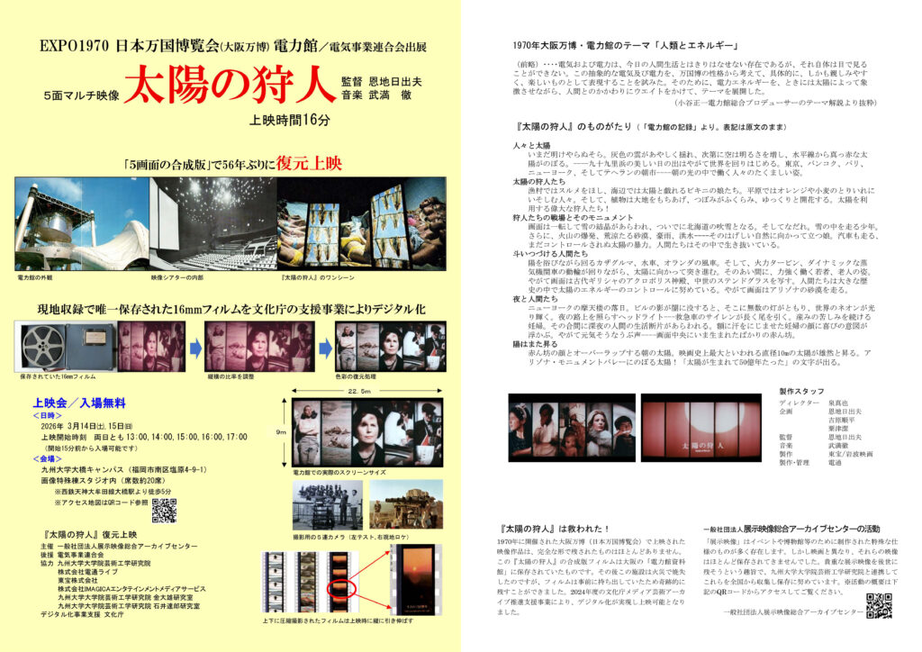 1970年の大阪万博(EXPO’70)で上映された5面マルチ映像作品『太陽の狩人』(監督:恩地日出夫/音楽:武満徹)が、唯一保存されていた16mmフィルムをもとにデジタル復元され、「5画面合成版」として56年ぶりに上映されます。
